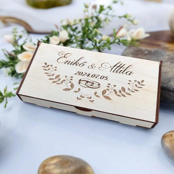 Az esküvői pénztartó doboz tökéletes ajándék, ha valami egyedit és emlékezeteset szeretnél nyújtani. A doboz mérete 17 x 8 x 2 cm , ami elegáns és praktikus megoldást kínál a hagyományos borítékok helyett. Nyírfából készült , ami nemcsak tartós és időtálló, hanem természetes és esztétikus is. A nyírfa finom erezete és világos színe bármilyen esküvői stílus