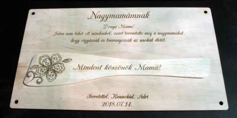Ez a Szülőköszöntő ajándék fakanál lapon kiváló ajándék lehet anyukáknak vagy nagymamáknak, akiket szeretünk. Ez a gyönyörűen kidolgozott ajándék, rétegelt lemezből és egy fakanálból áll, amelyek tökéletesen illeszkednek egymáshoz. A falap mérete 32 x 18 cm, így elegendő helyet biztosít a személyes üzenet megjelenítéséhez. A termék egyedi elképzelés alapjá