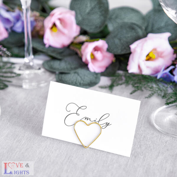 Arany színű ültetőkártya tartó, mely szép dekorációs eleme lehet az aszatlnak. Mérete: kb 2,5 * 2,5 cm Egy csomagban 10 db szív található. Amennyiben több darabra lenne szüksége mint amennyit a raktárkészletünk mutat, úgy 1-2 hét lehet a szállítási idő.
