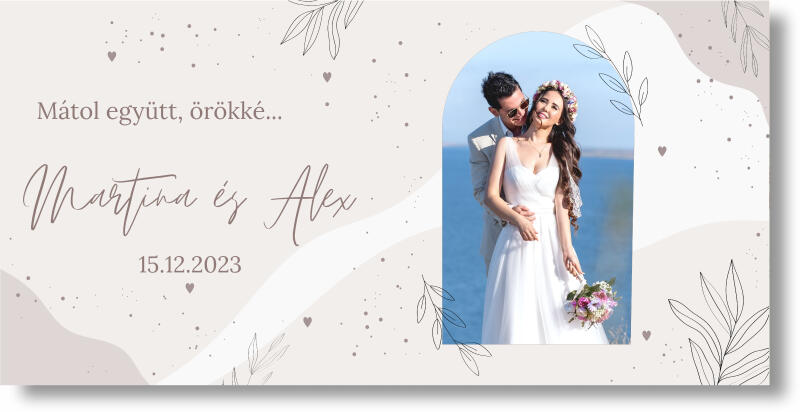 Az esküvői banner segítségével minden esküvőt személyessé varázsolhat. Válassza ki a saját fotóját a párról, adjon hozzá neveket, dátumot és kezdődhet az esküvői fogadás! Ilyen módon olyan egyedi és felejthetetlen pillanatot teremthet, amelyet minden pár élvezni fog. A banner könnyű és könnyen felakasztható. Az egyedi színárnyalatok vidám hangulatot kölcsönözn