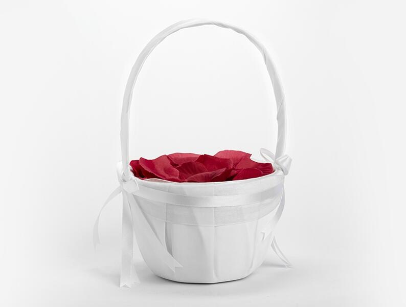 Szatén kosár rózsaszirmokra - fehér az alsó tároló rész átmérője 18 cm és magassága 10 cm a kosár magassága: 26 cm A kosár szilárd anyagból készült, szaténnal bevont, sifon szalaggal átkötött és kiegészítésként szatén maslikkal díszített.