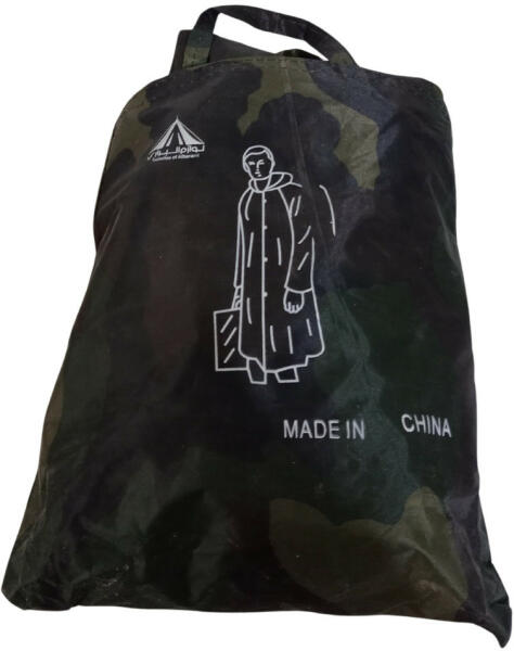 Terepmintás esőkabát táskában ZL-8012. A termék egy méretes. Mérete: 128 mellkörfogat, 110cm hossz.