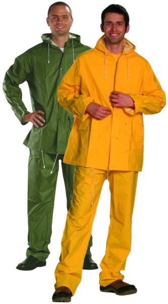 Poliészter/pamut alapra kétszer mártott PVC, 0,32 mm vastag, varrott és hegesztett, vízálló, cipzáras és patentos záródás, zsinórral állítható bőségű kapucni, két külső zseb, gumírozott mandzsetta, sav- és lúgálló kétrészes ruha kivitel, szín: zöld