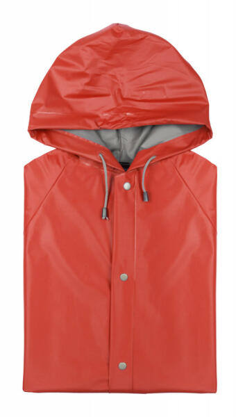 Kapucnis esőkabát ellenálló PVC anyagból, hőtartó bevonattal és két első zsebbel. Patenttal zárható.
