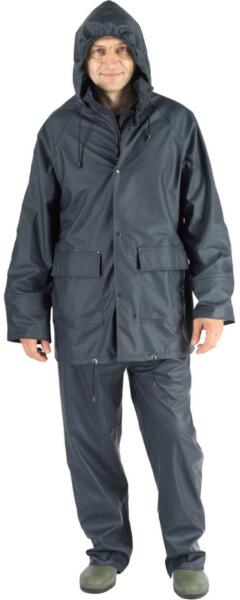 Erős, 300 g/m2 poliészterre mártott speciális PU/PVC mix, rendkívül könnyű, nagy szakítószilárdságú, kényelmes viseletű anyag, teljesen vízhatlan, varrott plusz hegesztett illesztések, KÉTRÉSZES RUHA (kabát+deréknadrág): kapucnis, cipzáros+patentos...