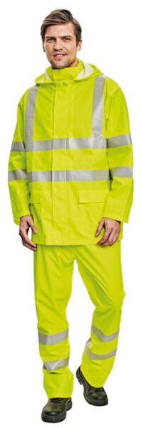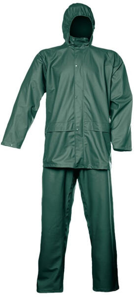 vízálló és szélálló öltöny, ?-es esőkabát gallérba hajtott kapucnival és rugalmas derekú nadrággalnem ropogó szövet, kettő széles mellső zseb hajtókával védve a víz bejutásától, az ujján patenttal állítható