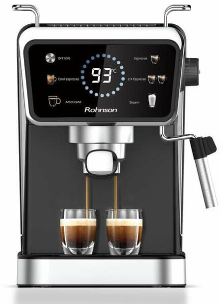 Kávéfőző hideg és meleg kávé elkészítéséhez 1,5 literes víztartállyal és 1350 W-os teljesítménnyel. A Rohnson R-98015 ikonokkal ellátott LED érintőképernyővel, 20 bar nyomással és egyszerre akár 2 csésze elkészítésének képességével büszkélkedhet. Nagynyomású fúvóka cappuccino készítéséhez