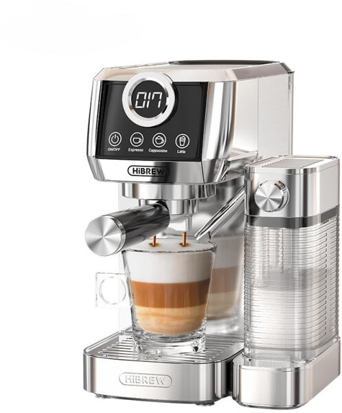 HiBREW H13A félautomata, karos, eszpresszó, kapucsínó, latte kávéfőző 3 az 1-ben Eszpresszó, Kapucsínó és Latte főzésére képes Szimpla és dupla adagok Programozható italmennyiség Dupla (független) vízmelegítő rendszer - Double Boiler System Érintőgombok, többszínű visszajelzéssel Kijelző 6 féle ital gombnyomásra Állítható kávé hőmérséklet (3 fokozat) Automat