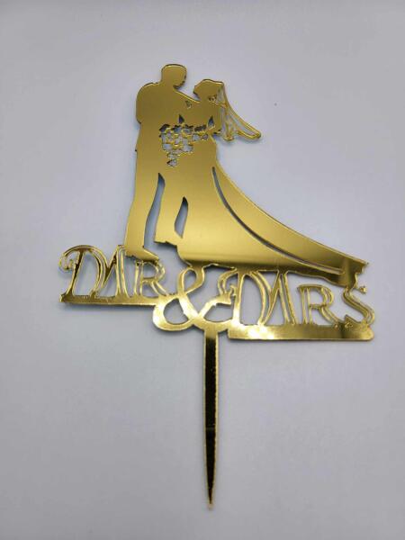 Tortadísz - Mr & Mrs arany esküvői pár Az egyedi aranyszínű díszítés az "MR & MRS" felirattal és az esküvői pár sziluettjével ideális kiegészítője az esküvői tortának. Ennek az elegáns dekorációnak köszönhetően még egy hétköznapi esküvői tortából is egyedi torta varázsolható, amelyet mindenki megcsodál. mennyiség: 1 db méret: 11 x 12 cm anyag: műanya