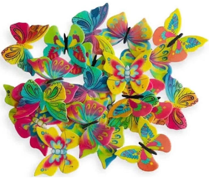 24 darabos, színes pillangókat mintázó, elővágott, ehető ostyapapír , melyek segítségével igazán különleges dekorációt varázsolhatunk az otthon készített tortáinkra és süteményeinkre. A csomagban 24 darab pillangó található. A pillangók méretei kb. 45 mm × 35 mm. Fontos: Az ostyapapírok érzékenyek a nedvességre, így a sérülés megelőzése érdekében javasoljuk