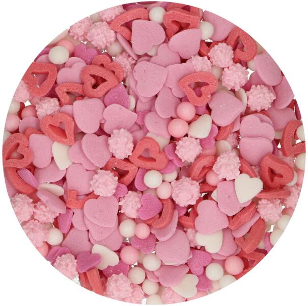 Cukrászdísz - Medley love 50 g A népszerű cukrászdísz különösen a desszerteken, tortákon, fánkon vagy krémes süteményeken tűnik ki. Alkalmas torták oldalának díszítésére. A cukordíszekkel díszitett torták különösen alkalmasak lányos születésnapokra. Tartalmaz cukor, dextróz, rizsliszt, glukózový sirup, növényi olaj és zsír (repce), hydrogénezett olaj (repce),
