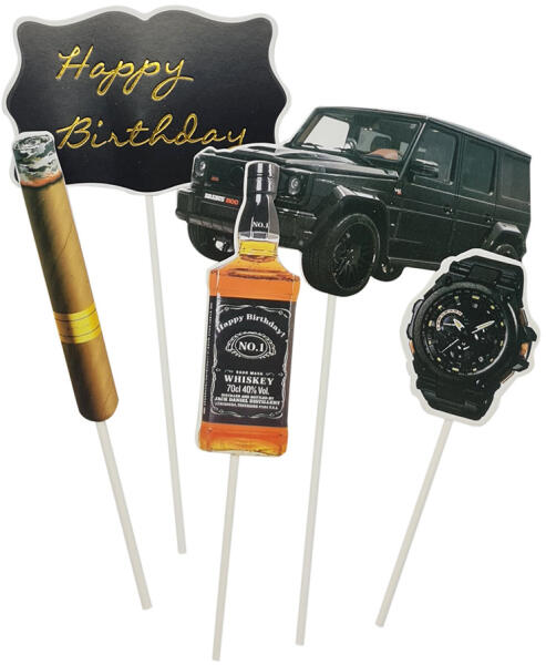 Torta dekoráció , torta beszúró, férfias mintával és Happy Birthday felirattal , mellyel Te is egyszerűen díszítheted az elkészült süteményeket és tortákat. Tulajdonságok: Anyaga: papír A beszúrók mérete: - A beszúrók magassága: 12,5 cm és 19 cm között