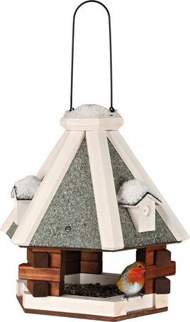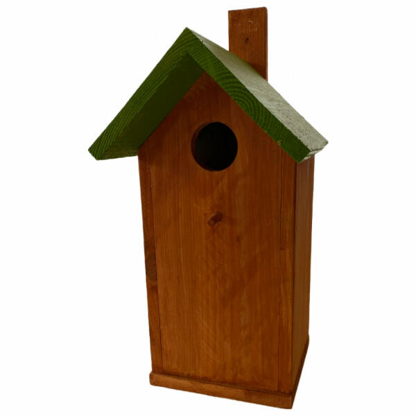 Mázas fenyőből készült kültéri, felakasztható madáretető. A tető túlnyúlása védelmet biztosít az időjárás viszontagságaitól a madaraknak. Csiszolt tetőszigetelésű.