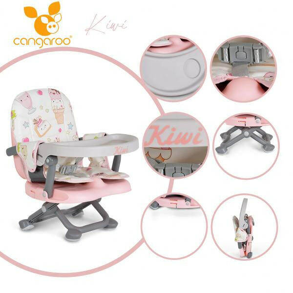 A Cangaroo Kiwi Cupcakes Design etetőszék, ami tökéletes választás 6 hónapos kortól, egészen 15 kg-ig. Az etetőszék négy különböző magasságba állítható , így könnyedén igazítható a baba és az asztal magasságához is . A szék rögzítése egyszerű, kiegészítő pántok segítségével bármilyen szokásos székre biztonságosan rátehető. Kompakt méretének köszönh