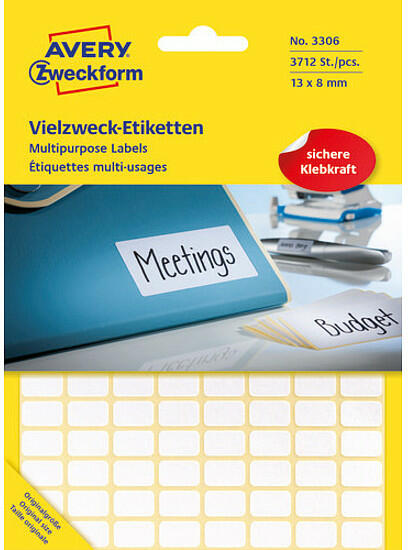 Az Avery-Zweckform fehér, tartósan tapadó 3306 cikkszámú 13x8mm méretű, kézzel feliratozható rendszerező címke ideális dokumentumok és iratrendezők címkézésére. 3712 db mini címkét tartalmaz a csomag. Különböző kiszerelésekben és méretekben kapható.