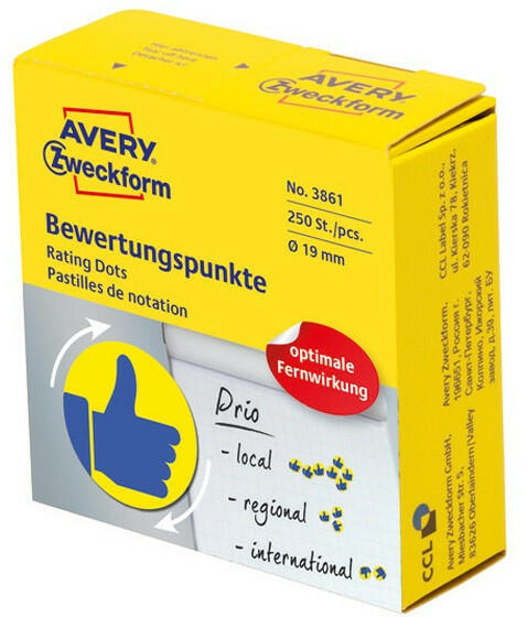 Etikett AVERY 3861 öntapadó jelölőpont adagoló dobozban kék hüvelykújj sárga alpon mintás 19mm 250 jelölőpont/doboz Etikett Avery Zweckform 3861 cikkszámú öntapadó kör alakú címkék hüvelykujjal. Címke méret: 19 mm átmérő. Színe: sárga alapon kék hüvelykujj. Kiszerelés: 250 jelölőpont / adagoló doboz.