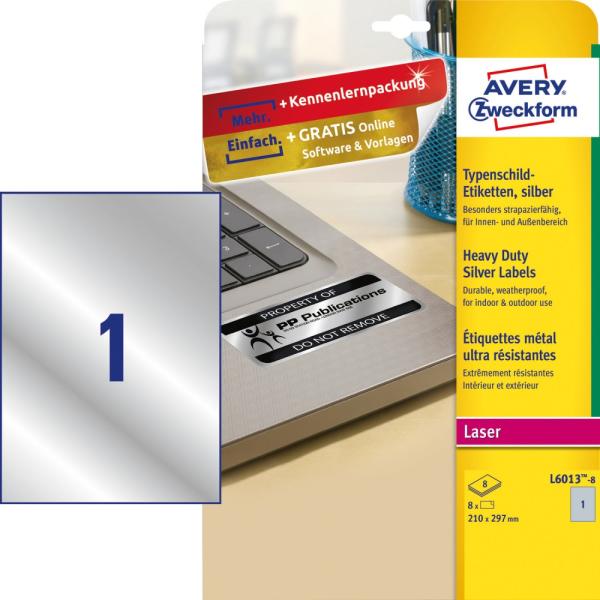 Címke mérete: 210 x 297 mm Avery Zweckform 210 x 297 mm méretű, ezüst színű, matt felületű, időjárásálló, ipari öntapadós etikett címke, A4-es lapon, erős, tartós ragasztóval, hegyes sarkokkal, valamint garantált elakadásmentes nyomtatással. Rendelési azonosító: Avery Zweckform L6013-8 . Nyomtatható: fekete-fehér lézernyomtatókban. Az optimális végeredmény érdeké