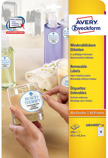 Az Avery Zweckform L6024REV-25 cikkszámú, ovális, 63,5x42,3 mm méretű visszaszedhető címkéi tökéletesek pl. dokumentumok, termékek felcímkézésére (450 címke/25 ív). A címkék megbízhatóan tapadnak, ugyanakkor ragasztómaradvány nélkül eltávolíthatóak a legtöbb felületről. Biztos lehet abban, hogy az ívek nem akadnak el nyomtatás közben és nem kerül ragasztómaradv