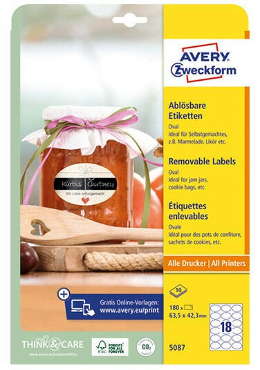 Etikett AVERY L5087 63,5x42,3 mm ovális visszaszedhető 10 íves Az AVERY ZWECKFORM 5087 cikkszámú 63,5x42,3 mm méretű visszaszedhető, ovális címkéje ideális házi készítésű finomságok, pl. lekváros, befőttes üvegek, likőrök, süteményes dobozok felcímkézéséhez. 180 címke 10 íven. A címkék megbízhatóan tapadnak üvegen, műanyagon, papíron és ragasztómaradvány n