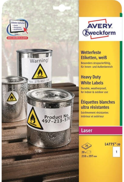 Címke mérete: 210 x 297 mm Doboz tartalma: 20 darab címke - 20 ív/doboz (1 címke/ lap) Strapabíró poliészter időjárásálló címkéi lézernyomtatókhoz, kifejezetten kültéri használatra készültek. Az erős, tartós tapadású ragasztónak köszönhetően tökéletesen időjárásálló, megbízható és tartós. A strapabíró, poliészter filmből készült etikettek olaj, szenny