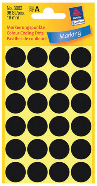 Az Avery Zweckform 18mm átmérőjű, Fekete színű jelölőcímkéi általános célú papír alapanyagból, Normál ragasztóval készülnek. Tökéletes megoldást jelentenek azonosításhoz, jelöléshez (ESD jelölő) raktározásnál és gyártásnál. A jelölőcímkék nem nyomtathatóak és nem fénymásolhatóak, kizárólag kézzel írhatóak és helyezhetőek fel. Egy csomagban 96 ön
