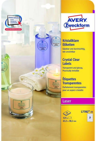 Etikett címke, 63,5 x38,1mm, víztiszta, 21 címke/ív, 25 ív/doboz, Avery átlátszó Címke mérete: 63,5 x 38,1 mm Doboz tartalma: 525 darab címke - 25 ív/doboz (21 címke / lap) Tökéletes megoldást nyújtanak az üveg, műanyag és fém tárgyak, valamint egyéb fényes felületek felcímkézésére. A címkék olaj-, szennyeződés- és hőállóak (-20°C és +80°C között), cseppá