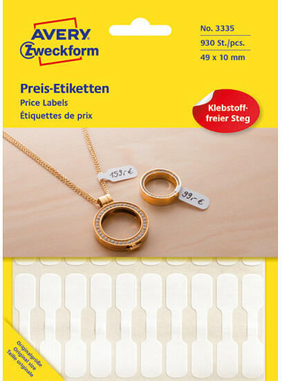3335 cikkszámú fehér univerzális AVERY ZWECKFORM súlyzó alakú árazó-, ékszercímke kézi feliratozáshoz. Tökéletes gyors és egyszerű, nyomtató nélküli árcímkézéshez. A csomag tartalma 924 címke/csomag. A súlyzó forma fogó része ragasztómentes - tökéletes az elegáns termékekhez.
