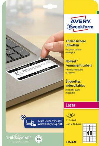 Címke jogosulatlan eltávolítás elleni védelemmel. A címke anyaga, ha megpróbálják eltávolítani, szétszakad, és csak nagyon apró darabokban jön le. Alkalmas biztonsági, vagy kalibrációs jelölésre, plombálásra. Ellenáll zsírnak, szennyeződésnek, víznek és a hőmérsékletingadozásnak (-40 és +120 °C között). Lézernyomtatóval tűélesen, elmosódásmentesen felirato