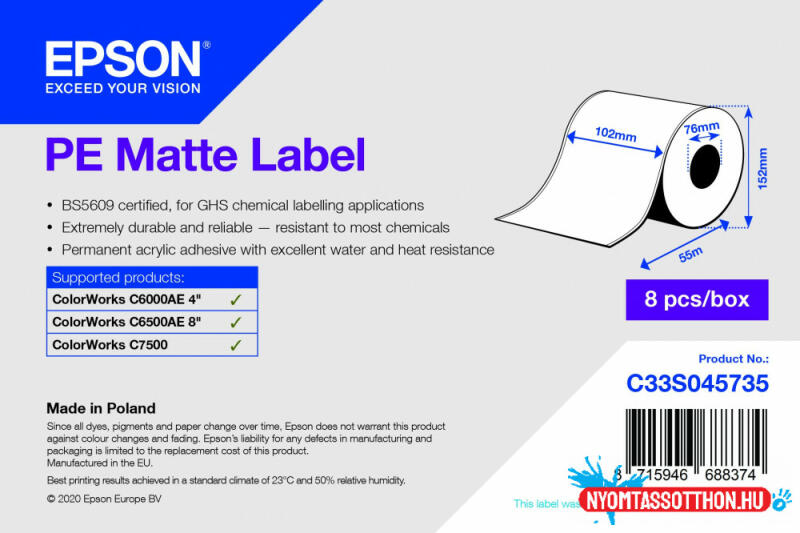 Epson 102mm X 55m matt címke Fehér, matt, tintasugaras szintetikus címke, amely megfelel a GHS vegyszercímkékre vonatkozó BS 5609 szabványnak. Ezekkel a víznek, hőnek és a legtöbb vegyszernek egyaránt ellenálló, PE-alapú címkékkel pontos, beolvasható, elmosódásmentes színes nyomatokat hozhat létre. A vízbázisú akrilragasztó kiváló tapadást és UV-ellenállást biztosí