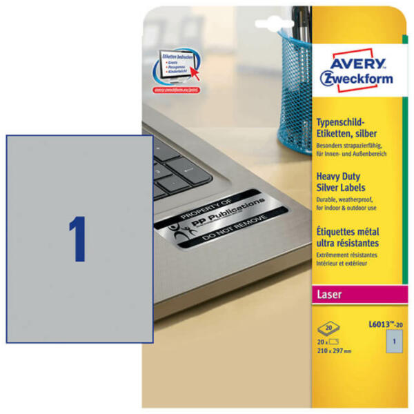 210*297 mm-es Avery Zweckform A4 íves etikett címke, ezüst színű (20 ív/doboz) A németországi Avery Zweckform több évtizedes tapasztalatának és folyamatos minőségellenőrzésének köszönhetően prémium minőségű etikett címkéket gyárt. Az Avery több száz féle felhasználásra gyárt öntapadó A4-es etikett címkéket, melyek a legkülönlegesebb felhasználási igényeket