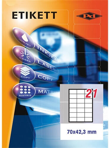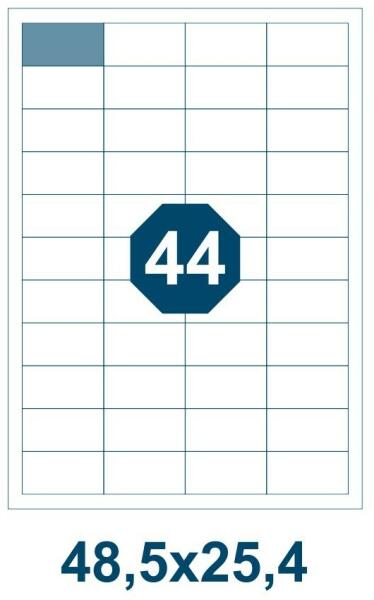 A címkék öntapadósak, cím, kód, terméknév, logó stb. rögzítésére használhatóak. Alkalmasak lézer- és tintasugaras nyomtatókkal történő nyomtatásra. Különböző méretekben és színekben kaphatók. méret (mm): 48,5 x 25,4 címkék száma laponként: 40 lapok száma csomagonként: 100 címkék száma a csomagban: 4000 szín: fehér nyomtatás fénymásolókkal, lézeres és