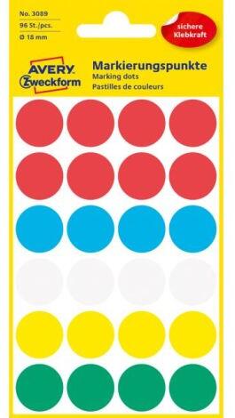 Kör alakú címkék a kézi leíráshoz. Átmérője 18 mm, 96 db címkét tartalmazó csomagban. Keverje össze a színeket.