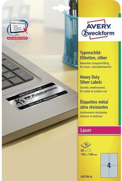Az Avery Zweckform L6134-20 cikkszámú, ezüst, strapabíró időjárásálló címkéi lézernyomtatókhoz 105x148mm méretben kifejezetten a tulajdon tárgyaink megbízható és professzionális felcímkézéséhez fejlesztve készültek. 80 db matt, ezüst, poliészter címke, 20 íven. A strapabíró, poliészter filmből készült etikettek olaj, szennyeződés-, UV- és hőállóak (-40°C