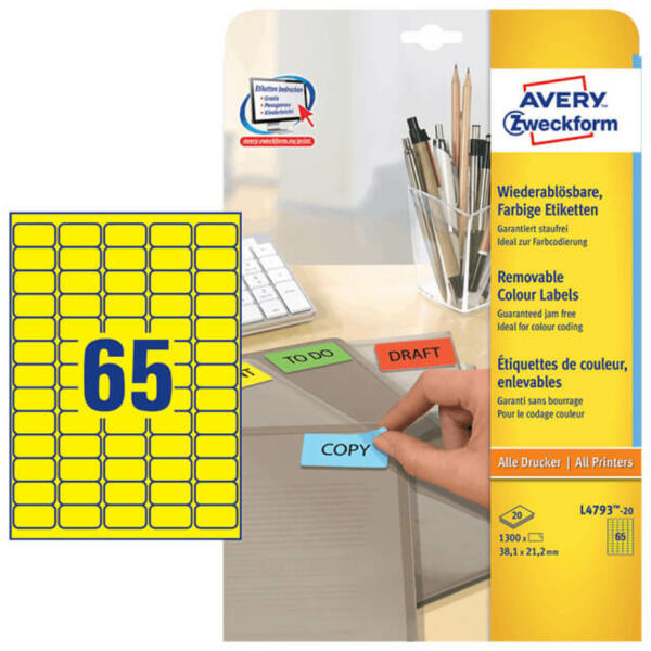 38,1*21,2 mm-es Avery Zweckform A4 íves etikett címke, sárga színű (20 ív/doboz) A németországi Avery Zweckform több évtizedes tapasztalatának és folyamatos minőségellenőrzésének köszönhetően prémium minőségű etikett címkéket gyárt. Az Avery több száz féle felhasználásra gyárt öntapadó A4-es etikett címkéket, melyek a legkülönlegesebb felhasználási igények
