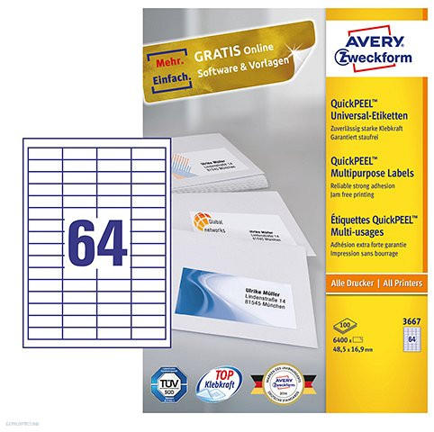 Univerzális fehér etikett címkék. A címke hátoldalán kifejlesztett ultragrip technológiának köszönhetően a lapadagolás pontos, a nyomtatás elakadásmentes. Egyszerű tervezés: ingyenes online szoftver és sablonok. Elakadásmentes nyomtatás a lézernyomtatókban a TÜV Süd által tesztelve. 100% kompatibilitás minden ismert nyomtatóval és fénymásolóval. Tiszta nyomtatási k