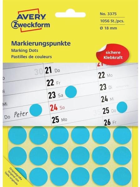Címke mérete: 18 mmCsomag tartalma: 1056 jelölőcímke/csomagAz AVERY ZWECKFORM jelölőpontok tökéletesek jelölésre, rendszerezésre, tervezésre, iratrendezésre. Katalóguskód: 25390
