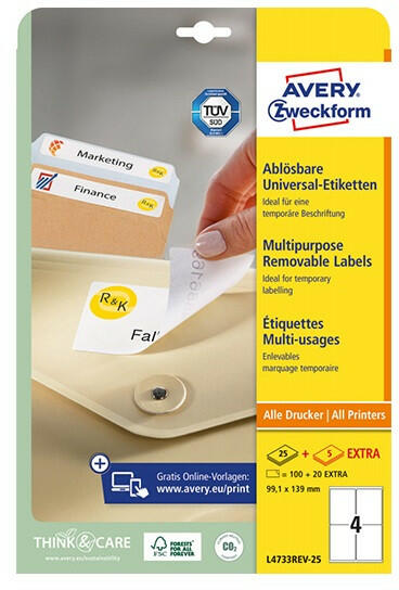 Etikett AVERY L4733REV-25 99,1x139 mm univerzális visszaszedhető 30 íves Az Avery Zweckform L4733REV-25 visszaszedhető címkéi, 99,1x139mm-es méretben tökéletesek a képeslap nagyságú etikettet igénylő termékek címkézésére (120 címke/csomag). A címkék megbízhatóan tapadnak, ugyanakkor ragasztómaradvány nélkül eltávolíthatóak a legtöbb felületről. Biztos lehet abban,