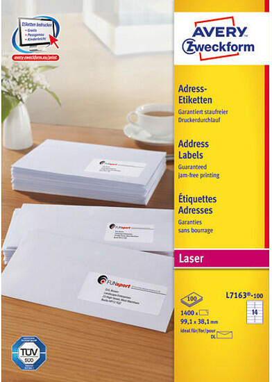 Avery Zweckform L7163-100 cikkszámú, fehér címzés címkék 99,1x38,1 mm méretben. Ezek az etikett címkék tökéletesen illeszkednek a DIN hosszúságú szabványméretű borítékokra. A csomag tartalma 1400 db FSC® minősített címke, 100 íven. Az innovatív, egyedi és érezhetően más, Ultragrip technológiai fejlesztéssel készült etikett címkék nyomtatása még a régebbi nyom