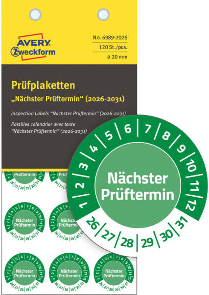 Címke mérete: 20 mm átmérőjű körcímke Avery Zweckform 20 mm átmérőjű, zöld színű, matt felületű, biztonsági, öntapadós hitelesítő címke (ellenőrzési matrica, plakett) 2026-2031-es évszámmal, 12 hónapos beosztással, Nächster Prüftermin felirattal, biztonsági ragasztóval. A speciális anyagának és ragasztórétegének köszönhetően a címkét nem lehet nyom nélk