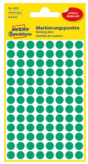 Etikett AVERY 3012 jelölőpont 8mm zöld 416 darabos Ideális térképjelölésre, szabadságtervezésre, határidő megjelölésére. Különböző méretben és színben elérhetőek.