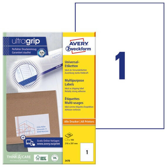 Etikett AVERY 3478 210x297mm univerzális 100 címke/doboz 100 ív/doboz A címke hátoldalán ultragrip technológiának köszönhetően a lapadagolás pontos, a nyomtatás elakadásmentes. Egyszerű tervezés: ingyenes online szoftver és sablonok. Elakadásmentes nyomtatás a lézernyomtatókban a TÜV Süd által tesztelve. 100 % kompatibilitás minden ismert nyomtatóval és fénymásolóval.