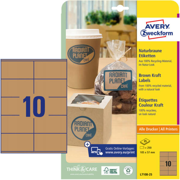 Újrahasznosított etikett címke 105x57 mm, Avery Zweckform, Barna színű, (25 ív/doboz) A németországi Avery Zweckform több évtizedes tapasztalatának és folyamatos minőségellenőrzésének köszönhetően prémium minőségű etikett címkéket gyárt. Az Avery több száz féle felhasználásra gyárt öntapadó A4-es etikett címkéket, melyek a legkülönlegesebb felhasználási ig