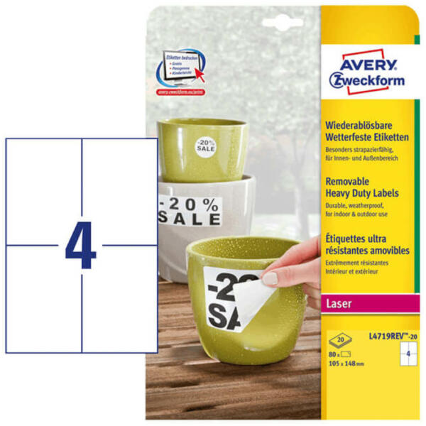 105*148 mm-es Avery Zweckform A4 íves etikett címke, fehér színű (20 ív/doboz) A németországi Avery Zweckform több évtizedes tapasztalatának és folyamatos minőségellenőrzésének köszönhetően prémium minőségű etikett címkéket gyárt. Az Avery több száz féle felhasználásra gyárt öntapadó A4-es etikett címkéket, melyek a legkülönlegesebb felhasználási igényeket