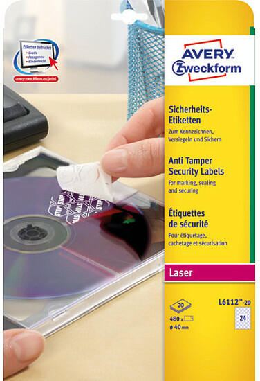 Avery Zweckform L6112-20 cikkszámú, fehér biztonsági címkék monokróm lézernyomtatókhoz. 40 mm átmérőjű méretben tökéletesek tulajdon tárgyaink biztonságos felcímkézéséhez. A csomag tartalma 480 db matt felületű, hamisíthatatlan poliészter etikett, 20 íven. A biztonsági címkék látható mintát hagynak maguk után, bármely eltávolítási kísérlet azonnal nyilvánva