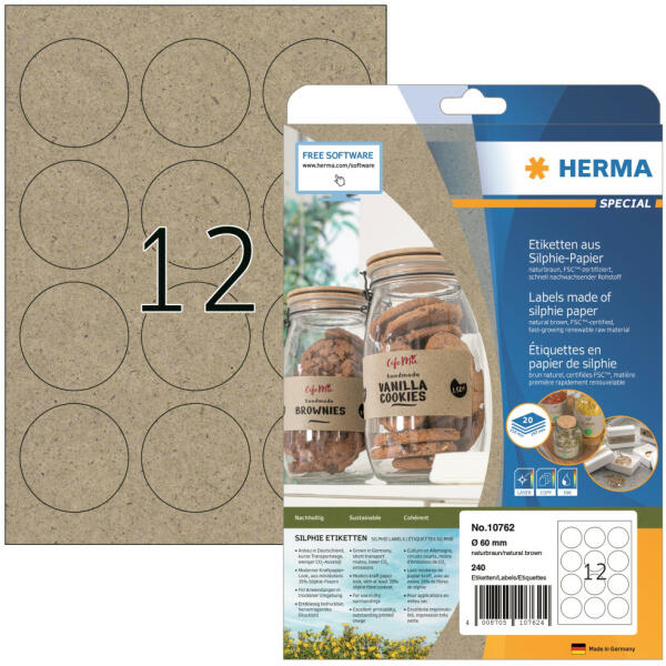 Címke mérete: 60 mm átmérőjű körcímke Herma 60 mm átmérőjű, környezetbarát, natúr barna színű, matt felületű, univerzális, nyomtatható öntapadós etikett címke, A4-es lapon, normál tapadású ragasztóval. A környezeti terhelés csökkentéséért a címkepapírt természetes rost szerkezetű alapanyag felhasználásával állítják elő. A nyomtató védelme érdekében