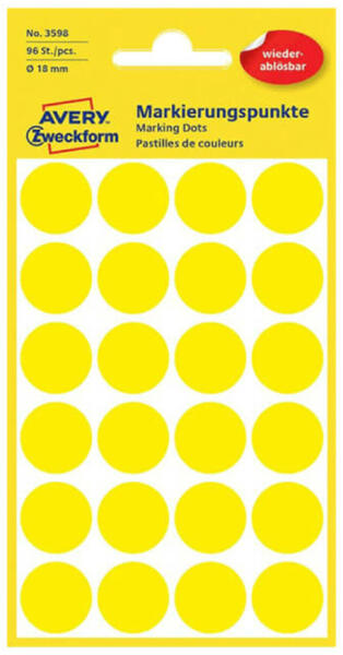 Az Avery Zweckform 18mm átmérőjű, Sárga színű jelölőcímkéi általános célú papír alapanyagból, Visszaszedhető ragasztóval készülnek. Tökéletes megoldást jelentenek azonosításhoz, jelöléshez (ESD jelölő) raktározásnál és gyártásnál. A jelölőcímkék nem nyomtathatóak és nem fénymásolhatóak, kizárólag kézzel írhatóak és helyezhetőek fel. Egy csomagba