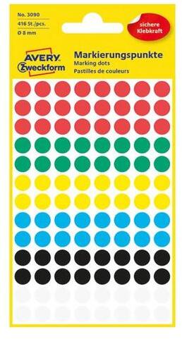 Etikett Avery-Zweckform 3008 cikkszámú. 8mm átmérőjű vegyes színeket tartalmazó öntapadó jelölőpontok. 416 körcímke/csomag (színek: fehér, piros, kék, zöld, sárga).