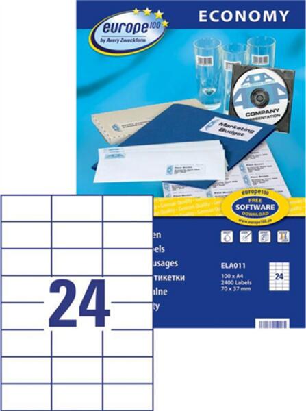 A4 ELA 011 etikett címke Europe 100 lézer és tintasugaras nyomtatóba egyaránt használható öntapadós normál papír címke normál tapadású , műanyag, karton, üveg, fém felületre jól alkalmazható beltéri használatra címke mérete 70 x 37 mm 100 lap/ doboz 2400 db / doboz