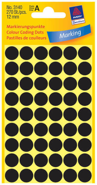 Az Avery Zweckform 12mm átmérőjű, Fekete színű jelölőcímkéi általános célú papír alapanyagból, Normál ragasztóval készülnek. Tökéletes megoldást jelentenek azonosításhoz, jelöléshez (ESD jelölő) raktározásnál és gyártásnál. A jelölőcímkék nem nyomtathatóak és nem fénymásolhatóak, kizárólag kézzel írhatóak és helyezhetőek fel. Egy csomagban 270 ö