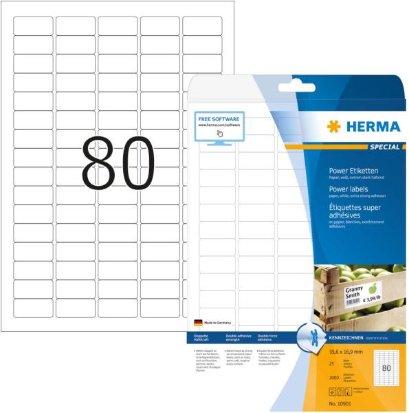 Címke mérete: 35,6 x 16,9 mm Herma 35,6 x 16,9 mm méretű, fehér színű, matt felületű, univerzális, nyomtatható öntapadós etikett címke, A4-es lapon, 2-szer erősebb tapadású ragasztóval (Power Etiketten, Power labels), kerekített sarkokkal. A nyomtató védelme érdekében a címkeív négy ragasztómentes lapszéllel rendelkezik. Megbízható, elakadásmentes nyomtatatási folya